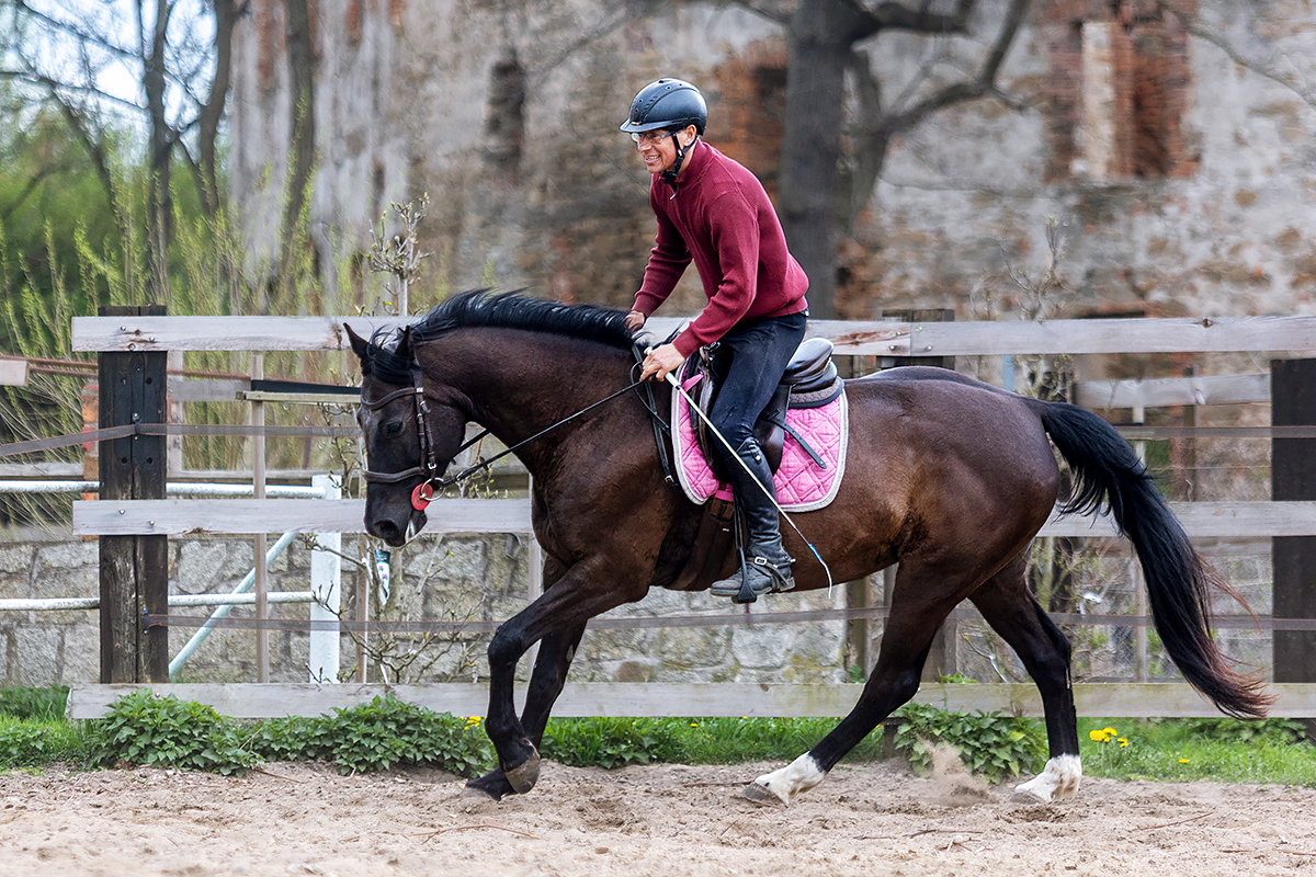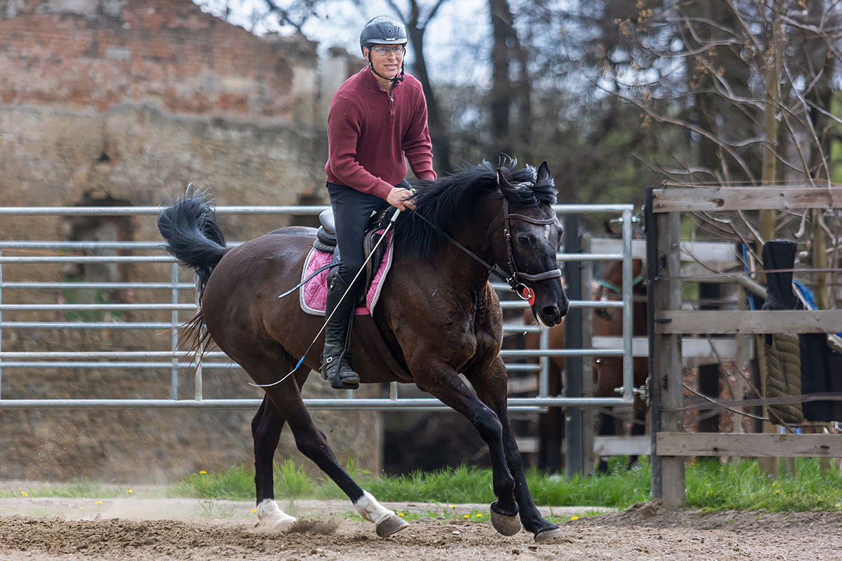 Koń nie spracowany treningami, pracujący 1-2 razy w tyg, chodzi w teren, na lonży pojedynczej i podwójnej, skacze (co wyraźnie lubi), zwrotna, chętnie robi pracę ujeżdżeniową. Zajeżdżona 2 lata temu, nie za dużo pracuje, ostatnie pół roku nic nie robiła (brak przestrzeni czasowej, oraz czekała w innej stajni w zapasie na et – nie jest źrebna)