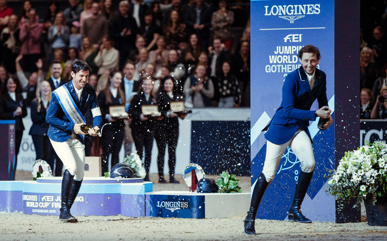 Na zdjęciu: Steve Guerdat i Martin Fuchs po zdobyciu pierwszego i drugiego miejsca w Finale Pucharu Świata w Goeteborgu w 2019. Zdjęcie: FEI