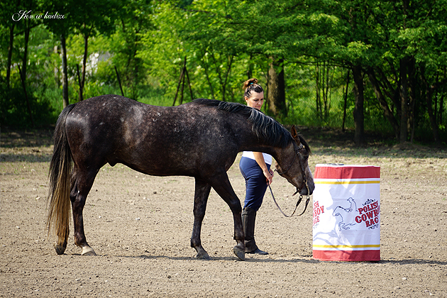 Pierwsze w Polsce szkolenie Polish Cowboy Race odbyło się od 11 do 13 maja w Ranczo Mary Lou D. w Koninie. Zorganizował je Witold Dzięcioł – właściciel rancza. Witold dysponuje stawką bardzo ciekawych koni, których dosiadało dziewięciu jeźdźców rekreacyjnych uprawiających jazdę western w Ranczo Mary Lou D. Rozpoczęliśmy od piątkowej części teoretycznej, podczas której rozmawialiśmy o specyfice i przepisach PCR oraz oglądaliśmy filmy z zawodów w 2017 roku. W sobotę odbyły się dwie tury treningów (przed i popołudniowa), w których wyodrębniono jeszcze mniejsze grupy (jeżdżono w zespołach cztero i pięcioosobowych). Agnieszka Olińska, autorka zdjęć do relacji, nakręcała również filmy z jazd, które oglądaliśmy w sobotę wieczorem. Metoda ta powinna być stosowana na każdym etapie szkolenia jeździeckiego. Ułatwia ona tworzenie wyobrażeń ruchowych związanych z dosiadem i współdziałaniem pomocami a w konsekwencji doprowadza do umiejętności analizy własnych zachowań ruchowych i ich autokorekty. Efekty sobotniej pracy było widać już w niedzielę, kiedy w sesji przedpołudniowej na arenie znalazło się zdecydowanie najwięcej przeszkód. PCR jest taką dyscypliną, gdzie istnieją przeszkody na różnym poziomie trudności. Tym samym, dla każdej pary koń-jeździec znalazło się coś interesującego do ćwiczenia, mimo tego, że zarówno stawka koni jak i grupa jeżdżących była zróżnicowana. Próbowaliśmy m.in. cofania w korytarzu (także po literze L), pracy drągach na prostej i na łuku, bramki, ciągnięcia opony na lassie, przenoszenia różnych przedmiotów (m.in. trudnej dla nie przyzwyczajonych koni flagi), przejazdów przez płachtę foliową, bramy z makaronów pływackich, cyrkla, przejazdu przez kotarę, rzucania podkowami do celu czy nabierania kół na szpadę.