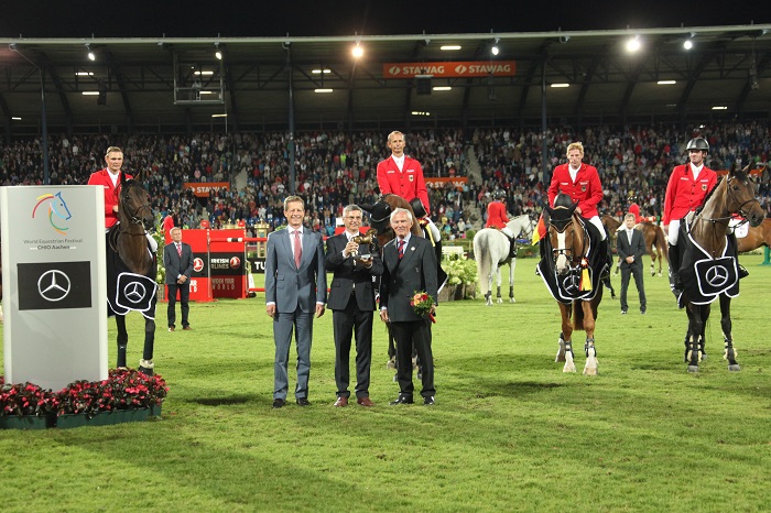 Zespół Niemiec wygrał wczoraj konkurs Pucharu Narodów w Aachen, po raz drugi z rzędu po raz 28 w historii tych zawodów. Po raz pierwszy od 17 lat w zespole gospodarzy nie znalazł się nikt o nazwisku Beerbaum – z tą sytuacją wielu musiało się najpierw oswoić. Jak również z tym, że w oficjalnej ekipie znalazło się dwoje debiutantów i 23-latków. Laura Klapakhe ostatecznie nie wystartowała. Ale swoją szansę dostał i doskonale wykorzystał Maurice Tebbel, który na 10-letnim ogierze Chacco’s Son pokonał oba nawroty bezbłędnie. Koń ten trafił do stajni rodziny Tebbel jako źrebak i od początku pracował z nim Maurice, który prezentował go podczas uznawania ogierów, startował w konkursach dla młodych koni i doprowadził do najwyższego światowego poziomu. Dwa razy na zero pojechał też Marcus Ehning na wałachu Pret a Tout, który rok temu też był w zespole. Żartował on później, że to ogromna szkoda, że Ludger Beerbaum już nie jest w kadrze Niemiec, bo teraz on, mając 43 lata, jest najstarszym zawodnikiem w ekipie. Dla Philippa Wesihaupta był to wyjątkowy dzień nie tylko ze względu na zwycięstwo i podwójne „zero” ale też ponieważ wczoraj obchodził on swoje 32 urodziny. „Happy Birthday” zaśpiewało mu wczoraj ponad 40 000 widzów. Czwartym zawodnikiem w zespole był Marco Kutscher, któremu szczęście wczoraj nie dopisywało. Jego wałach Clenur zatrzymał się w pierwszym nawrocie przed rowem z wodą, w drugim miał jedną zrzutkę i w obu nawrotach jego wynik nie liczył się. Niemcy ukończyli Puchar Narodów w Aachen z wynikiem idealnym, 0 pkt.