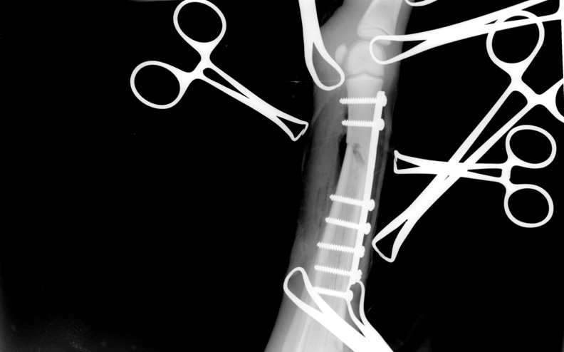 Właściciel instruowany przez lekarza weterynarii wykonał je samodzielnie. Złamanie kości podudzia.