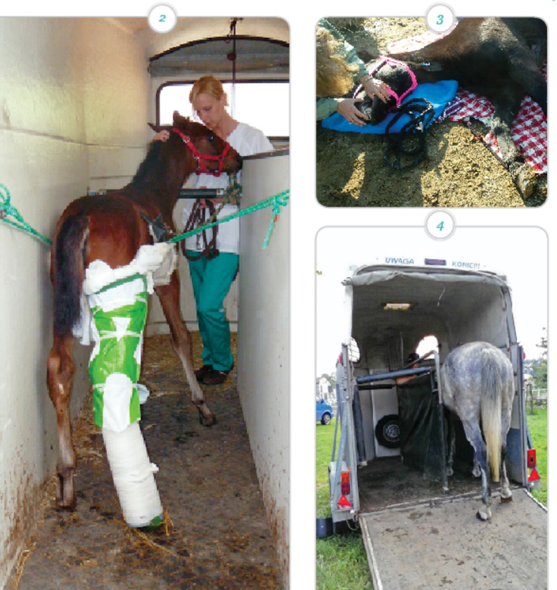 2. Odpowiednie zabezpieczenie złamania. Podwieszenie źrebaka na czas transportu.