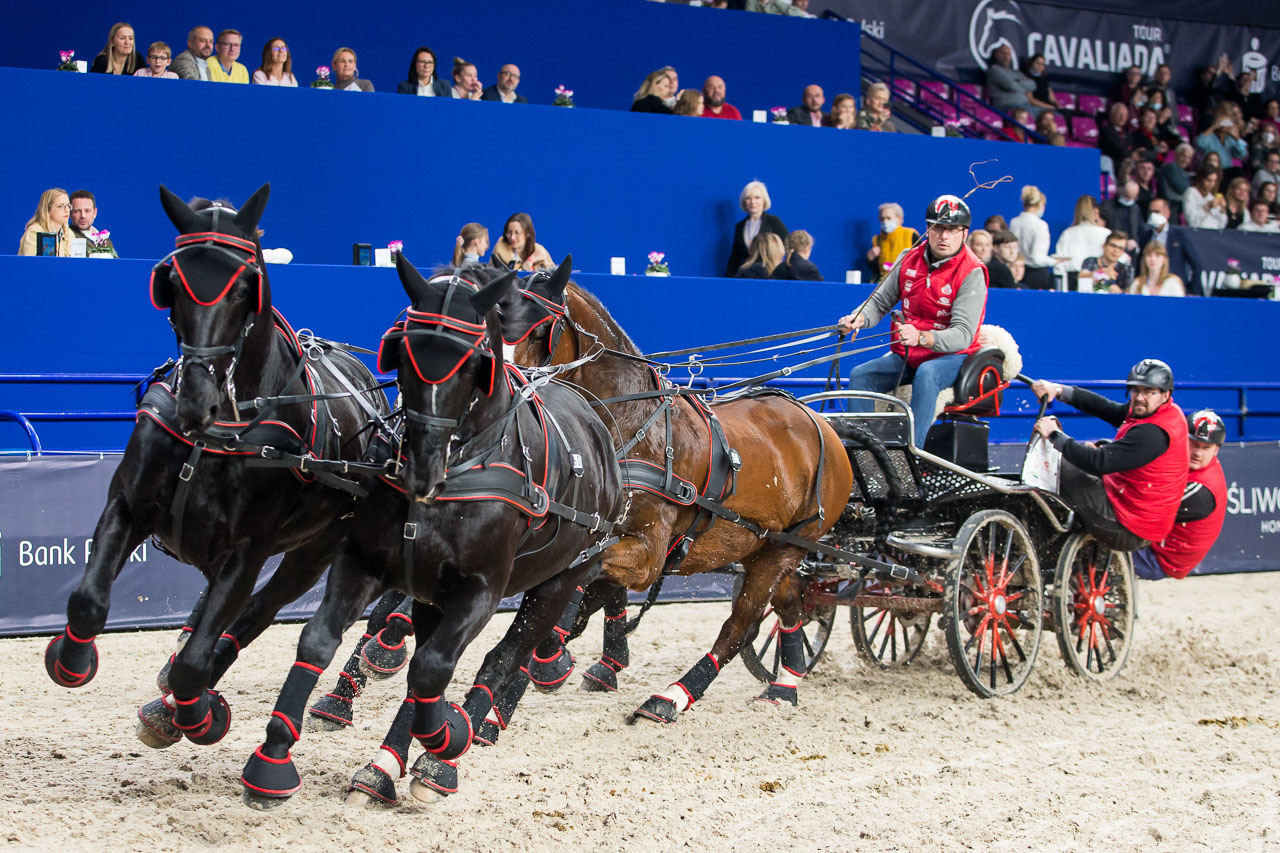 I to doświadczenie Bartłomieja Kwiatka zaprocentowało w dzisiejszym finale. Po zaciętej walce w drugim nawrocie został zwycięzca warszawskiego etapu Halowego Pucharu Polski w Powożeniu. Zawodnik startował z końmi DIEGO, AROMAT, RODOS oraz ELDORADO, a luzakowali mu Wacław Woźniczka i Wojciech Zyśk. Przecięli linię mety z czasem 108,25 s. O ułamki sekund wolniejszy był Piotr Mazurek powożący końmi PELOPONEZ, BLIZARD, JAŚMIN i INWENCJA. Czas przejazdu tego zawodnika to 108,56 s. Drugie miejsce wywalczył wspólnie z luzakami Mirosławem Górnym i Tomaszem Cichockim. Na miejscu trzecim uplasował debiutant, najmłodszy w stawce, 20-letni Aleksander Fularczyk w zespole z luzakami Andrzejem Fularczykiem i Pawłem Lesnerem. Na Cavaliadzie powoził końmi EDJE, ARES, NEPTUN oraz NUTA. Nie ustrzegł się błędów, ale rywalizował z doświadczonymi zawodnikami jak równy z równym. Czas przejazdu jaki uzyskał to 122,52 s. Kolejny etap Halowego Pucharu Polski w Powożeniu odbędzie się podczas Cavaliady w Poznaniu, która zagości na terenie MTP w dniach 16-21.12.2021r.