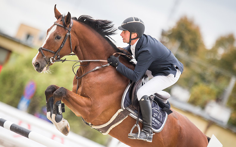 Po południu zawodnik zmierzył się też z konkursem Grand Prix 145 cm LR. Tu dosiadał holsztyńskiego wałacha CASTIGO DE AMOR. Niestety ten start zakończył się eliminacją w przebiegu podstawowym konkursu.
