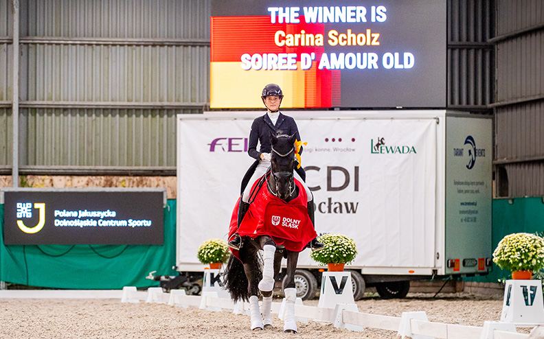 Za nami pierwszy finał zawodów CDI Wrocław i to w randze Grand Prix. Konkurs dowolny z muzyką, zaliczany do Pucharu Świata, wygrała dzisiaj Carina Scholz z Niemiec. Katarzyna Milczarek zajęła 4 miejsce w tym samym konkursie.