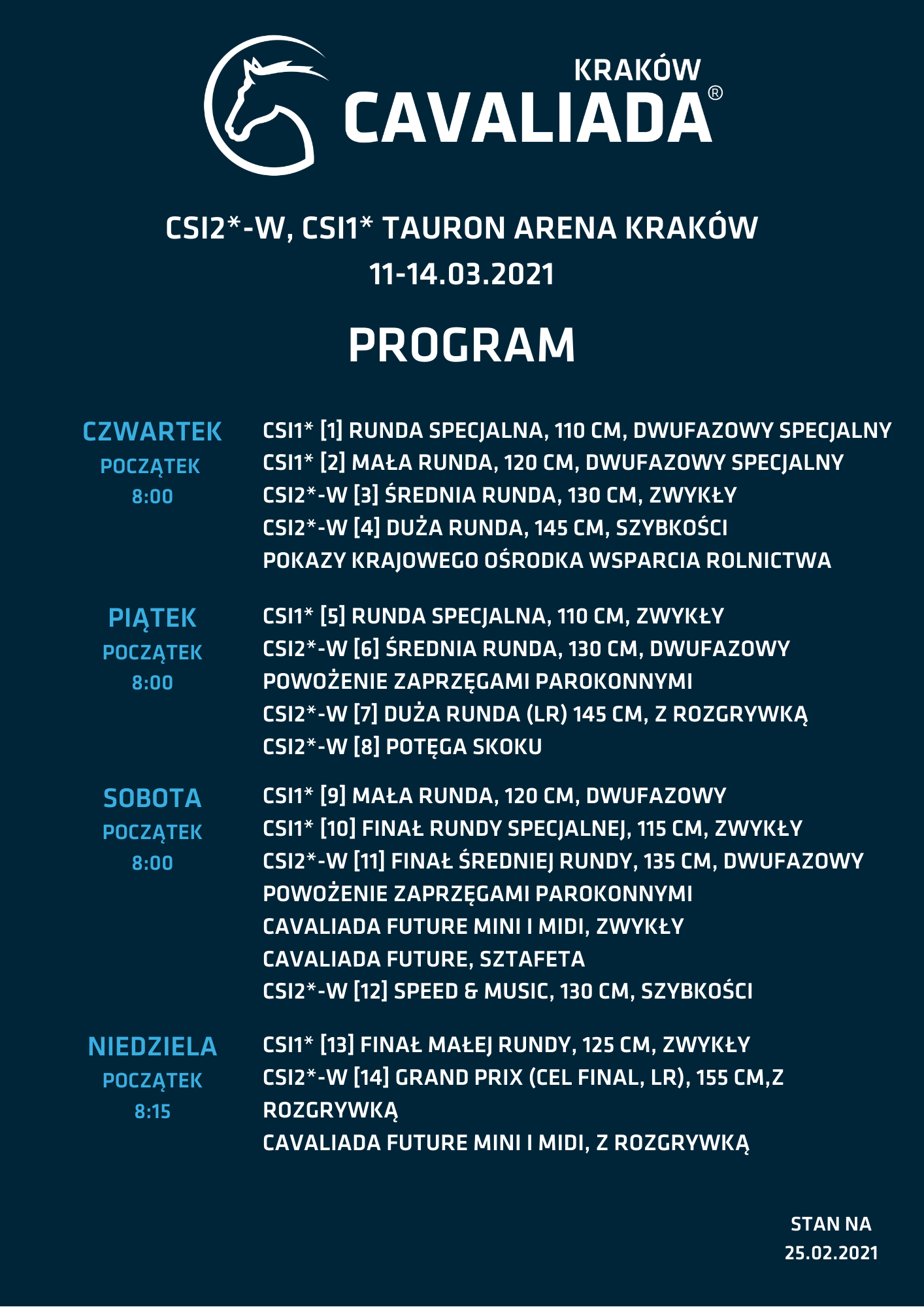 Zawody w skokach przez przeszkody przyciągną na start najlepszych zawodników z Polski i Europy. Sportowe emocje na najwyższym poziomie zapewni finał Ligi Europy Centralnej Pucharu Świata. Dla zawodników walczących o awans do Finału Pucharu Świata, który odbędzie się na przełomie marca i kwietnia w Göteborgu Kraków to ostatni i najważniejszy przystanek w walce o spełnienie marzeń. To właśnie podczas CAVALIADY poznamy trzech najlepszych zawodników naszej ligi, którzy zakwalifikują się do finału. Najważniejszym punktem programu będzie niedzielne Grand Prix o nagrodę Prezesa PKO Banku Polskiego – sponsora głównego CAVALIADA, pod patronatem Prezydenta Miasta Krakowa.