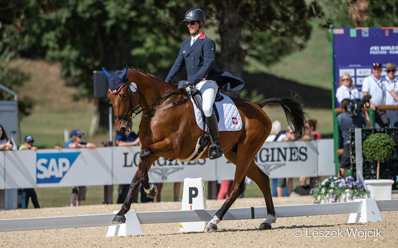 Jan Kamiński: Jestem bardzo zadowolony z tego co pokazaliśmy dzisiaj na czworoboku. Przejazd był w 90% taki jak zakładaliśmy. Wiadomo, że zawsze jest coś co można wykonać lepiej. W naszym przypadku chody boczne mogły być bardziej elastyczne. Pracujemy ciągle nad tym, ale poprawa tych elementów zajmuje dużo czasu. Ale od strony technicznej przejazd był bardzo dobry. Większość elementów wykonaliśmy prawidłowo. Jeszcze stęp był może za mało odważnie pojechany, mogłem dać Jardowi więcej swobody. Ale z reszty jestem zadowolony. To co dla mnie jest ważne to to, że Jard z biegiem czasu wie po co jest na takich dużych imprezach i potrafi się coraz lepiej skoncentrować. I trzeba powiedzieć, że tutaj w Pratoni czuje się bardzo dobrze. Pamiętajmy, że to jest bardzo trudny program i trzeba kilku startów by się objeździć bo poszczególne ruchu następują po sobie bardzo szybko. Większość koni które tu startują są starsze niż Jard i Canvalencia Małgorzaty Koryckiej i mają one dużo większe doświadczenie. Przed nami próba terenowa, która będzie bardzo wymagająca. Kros jest naprawdę godny rangi Mistrzostw Świata. Szczerze mówiąc to pewnie najtrudniejszy kros jaki mi przyjdzie jechać w życiu. Jest bardzo dużo technicznych zadań, od początku trzeba jechać bardzo precyzyjnie. Giuseppe della Chiesa, który budował kros powiedział, że jest wiele miejsc. Które są nieoczywiste i wymagają podjęcia decyzji i szybkich reakcji. Na ten moment mam plan jak pokonać poszczególne kombinacje i fragmenty trasy. Ale ten plan może się jutro zmienić na kilka sekund przed dojazdem do danej przeszkody. Trzeba być czujnym i szybko analizować sytuację. Proszę za nas trzymać kciuki jutro!