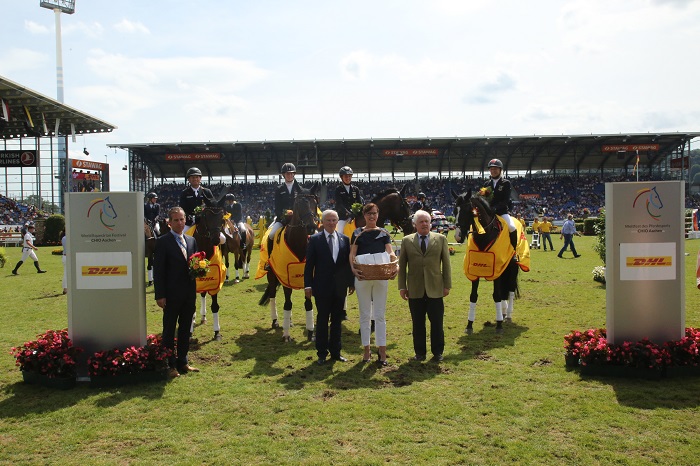 Ingrid Klimke, Michael Jung, Sandra Auffarth i Josefa Sommer zachowali stalowe nerwy i zwyciężyli w konkursie zespołowym CICO3* w Aachen. Wszyscy nie mieli błędów na krosie a jedynie dwie ostatnie amazonki otrzymały punkty za spóźnienia. „ To niesamowite uczucie być tutaj razem z tymi bohaterami i patrzeć na ich zwycięstwo.” – powiedział trener niemieckiej kadry Hans Melzer. Ci jego bohaterowie ukończyli zmagania z doskonałym wynikiem 107,00 pkt. deklasując przeciwników. Na drugim miejscu uplasowali się reprezentanci Australii, którzy na swoim koncie mieli 152,60 pkt. Trzecie miejsce przypadło ekipie Szwecji, która startowała w 3-osobowym składzie i ukończyła z wynikiem 160,60 pkt.