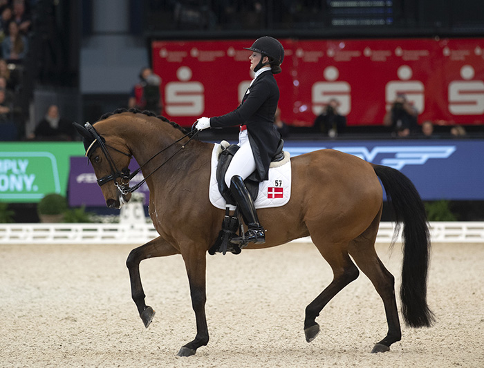 Przedostatnią zawodniczką w konkursie była Cathrine Dufour/DEN dosiadająca 10-letniego wałacha Vamos Amigos. Dla niej był to pierwszy start w Finale Pucharu Świata i tym samym również dla tego utalentowanego młodego konia. Dufour zaprezentowała znany już widzom program ułożony dla jej innego konia, wałacha Bohemian. Vamos Amigos wczoraj był niesamowicie elektryczny i naładowany energią co widać było szczególnie w kłusie wyciągniętym, w piaffach brakowało mu jeszcze równowagi. Ale pokazał bardzo dobry stęp i galop. Choć w drugiej połowie programu, szczególnie w piruetach i zmianach co dwa tempa był zbyt ciasny w szyi pomimo, że zawodniczka próbowała go podnieść i wydłużyć. To koń, który w kolejnych latach z pewnością będzie należał do najlepszych na świecie. Ale czy wczoraj był lepszy od Weihegold OLD? Według sędziów tak, choć w niewielkim stopniu. Wynik 86,164% oznaczał drugie miejsce dla Cathrine Dufour w jej pierwszym Finale Pucharu Świata.