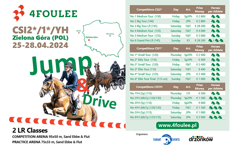 Opublikowane zostały propozycje zawodów 4Foulee CSI Zielona Góra, które odbędą się w dniach 25-28 kwietnia. Na zawodników czekają zmagania w trzech kategoriach: CSI2*, CSI1* oraz CSI młodych koni.