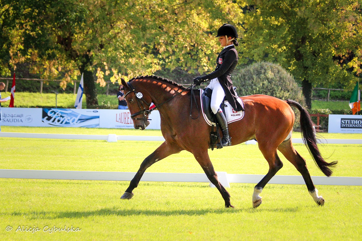 Dzisiejszego dnia startowały dwie Juniorki. Małgorzata Cybulska na Chenaro 2 po dwóch spłoszeniach konia w czasie programu skończyła przejazd z 54,00 pkt karnymi i zajmuje po ujeżdżeniu 46. pozycję. Julia Elzanowska na Lucky Come Back po bardzo ładnym przejeździe otrzymała 48,20 pkt co zapewniło jej 22. pozycję. Camila Garbien na Blue Moon Rising po dzisiejszym dniu przesunęła się na 58. pozycję a Milena Jarowicz na Lobo na 72. miejsce. Tym samym nasza drużyna po ujeżdżeniu zajmuje 9. miejsce na 13 z łącznym wynikiem 159 pkt.