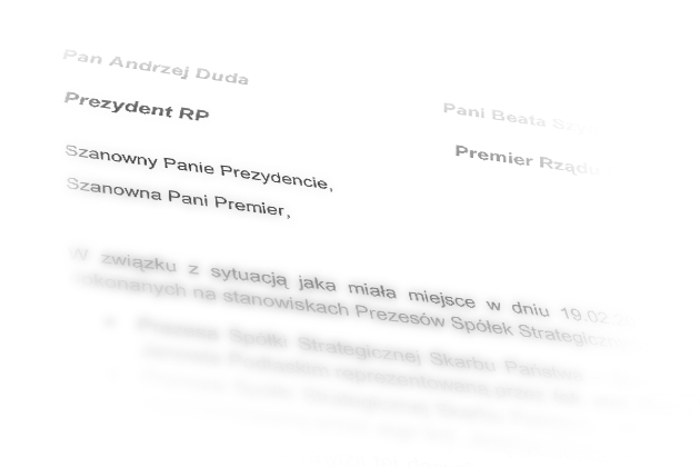W związku z sytuacją jaka miała miejsce w dniu 19.02.2016 a dotyczyła zmian dokonanych na stanowiskach Prezesów Spółek Strategicznych Skarbu Państwa a to: