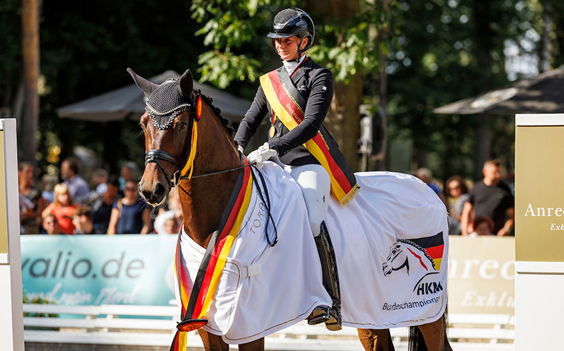 Nowym mistrzem Niemiec siedmiolatków został syn Dimaggio, oldenburski Dos Amigos. Dosiadany przez swoją właścicielkę, Leonie Richter, już w zeszłym roku wygrał mistrzostwo landu. 26-letnia berajterka ze stajni Andreasa Helgstranda pracuje z tym koniem od trzech lat, ale startowała bardzo oszczędnie. Sędziowie wysoko ocenili elastyczność i zdolność do przyjmowania obciążeń i zebrania, ale życzyli sobie więcej wydłużenia ramy w chodach pośrednich. Drugie miejsce zajął Famous K FRH pod Stefanie Wittmann. Potomek hanowerskiego Finest był chwalony za naturalny sposób prezentacji. Mile widziana byłaby większa siła pchająca. Najsłabszym punktem był galop. Trzecie i czwarte miejsce zajęły konie prezentowane przez Hiszpana Borję Carrascosa: Fun4Ever po Feedback i Frizzantino 28 po Finest. Oba zostały podobnie ocenione na powyżej 78%.