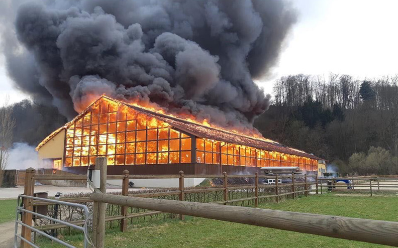 Nie wiadomo jeszcze co było przyczyną pożaru jaki dziś popołudniu wybuchł w stajni reprezentanta Austrii. Ponad 25 zastępów strażackich próbowało ugasić ogień, który doszczętnie zniszczył halę i znajdująca się przy niej stajnię. Według najnowszych informacji zginęło 9 koni, a 15 innych udało się uratować.