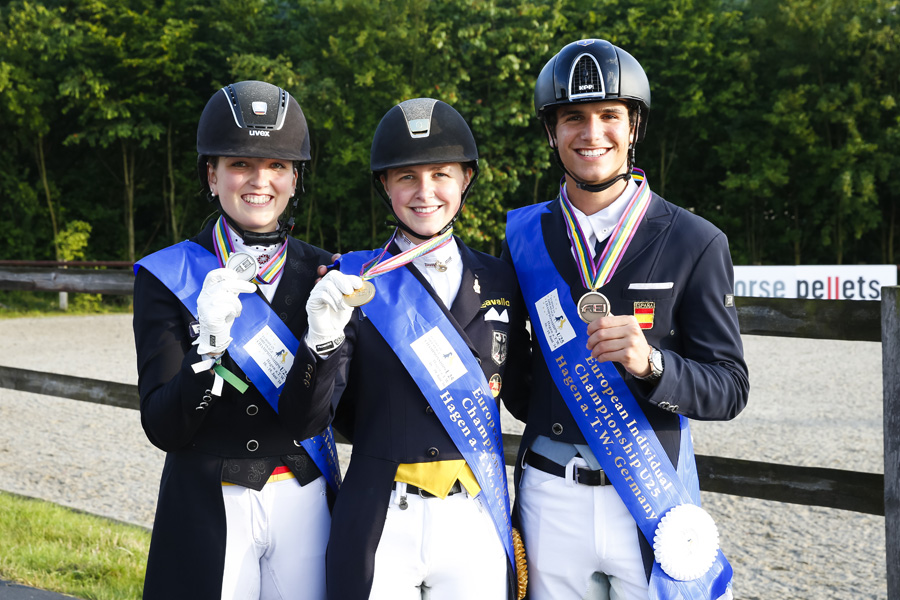 Miejsca na podium zajęło troje jeźdźców, którzy mają na swoim koncie już kilka a nawet kilkanaście medali ME w różnych kategoriach wiekowych. Zwyciężyła 23-letnia Sanneke Rothenberger z Niemiec na 15-letnim wałachy Deveraux OLD. Para ta specjalnym dla tej grupy wiekowej konkursie Grand Prix uzyskała wynik 75,977%. Jest to już niezwykle doświadczona amazonka, która pierwsze medale zdobywała w kategorii Pony. „To jest chyba mój 17 medal, nie jestem pewna, musiałabym je policzyć.” – powiedziała po kolejnym sukcesie. Wraz ze swoim koniem zdobywała ona złote medale indywidualnie i drużynowo w kategorii juniorów i młodych jeźdźców, teraz nadszedł czas na kolejny etap. Dzisiaj zaprezentuje ona swój przejazd do muzyki, który pokazała już rok temu podczas zawodów CDIO w Hagen i uzyskała wynik powyżej 79%.