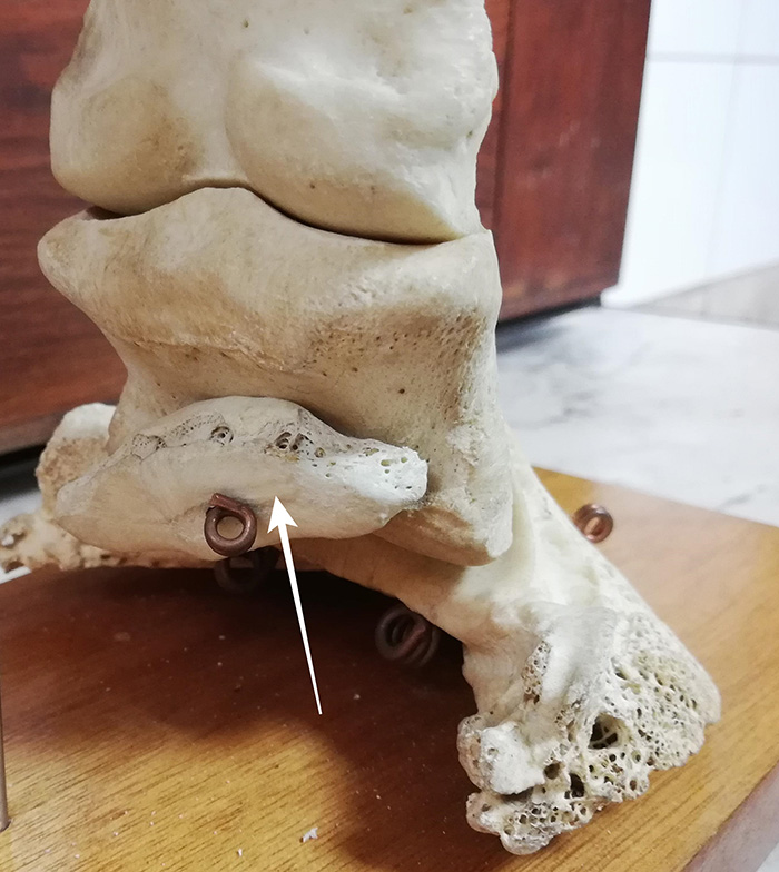 Strzałka wskazuje trzeszczkę kopytową na preparacie anatomicznym części dystalnej (dalszej) kończyny konia.