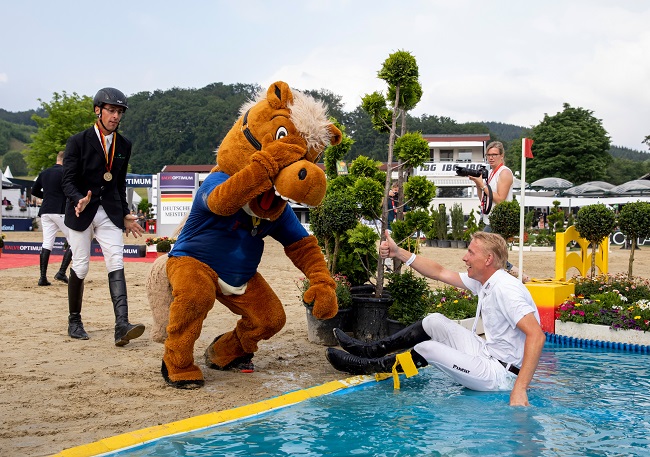 W skokach (mężczyźni) po swój pierwszy seniorski złoty medal w karierze sięgnął Mario Stevens. Ten sukces należy jeszcze bardziej docenić z dwóch powodów – pierwszy to taki, że 6 tygodni temu zawodnik przeszedł operację z powodu pęknięcia wrzodu żołądka. Druga sprawa to to, że były to dopiero jego drugie zawody na 11-letnim wałachu Talisman de Mazure (Quaprice - Alcamera La Silla). Wcześniej na tym koniu jeździli John Whitaker i Francois Mathy Jr. Stevens i Talisman nie zrobili ani jednego błędu w 4 trudnych parkurach – ale w trzech z nich przekroczyli normę czasu stąd wynik końcowy 3 pkt. Nowy Mistrz Niemiec za tydzień wystartuje podczas CSIO w Sopocie.