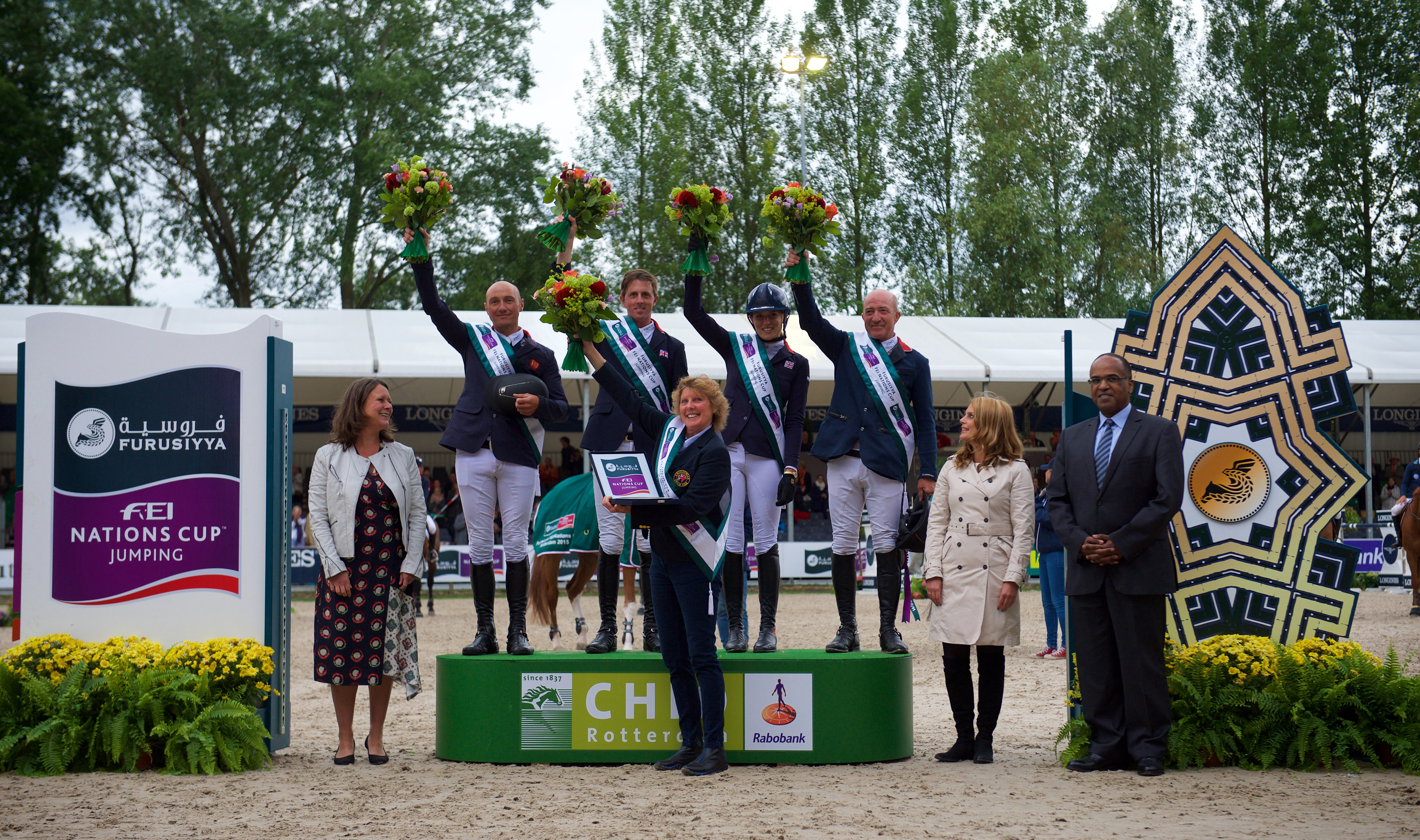Po zwycięstwach w konkursach Pucharu Narodów w La Baule i Rzymie, Brytyjczycy okazali się najlepsi również w Rotterdamie. Zespól w składzie Ben Maher, Joe Clee, Jessica Mendoza oraz Michael Whitaker ukończył konkurs z wynikiem 5 pkt. Na drugim miejscu uplasowała się ekipa Francji z wynikiem 7 pkt., a na trzecim Szwecji – 10 pkt. Prowadząca po pierwszym nawrocie drużyna Niemiec nie utrzymała doskonalej formy i z wynikiem 12 pkt. zajęła miejsce czwarte.